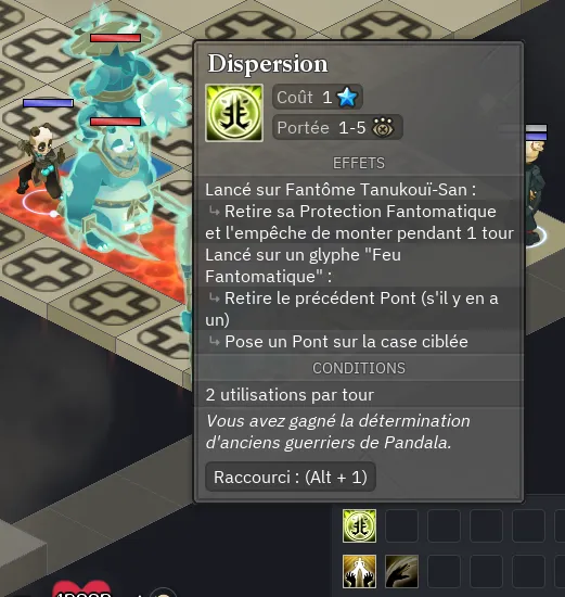 Il peut pousser dans toutes les directions grâce à son sort dispersion qu’il peut lancer de 2 à 4PO : le sort vous déplacera de 1 cases (ou 2 s’il a moins de 35% PV)
